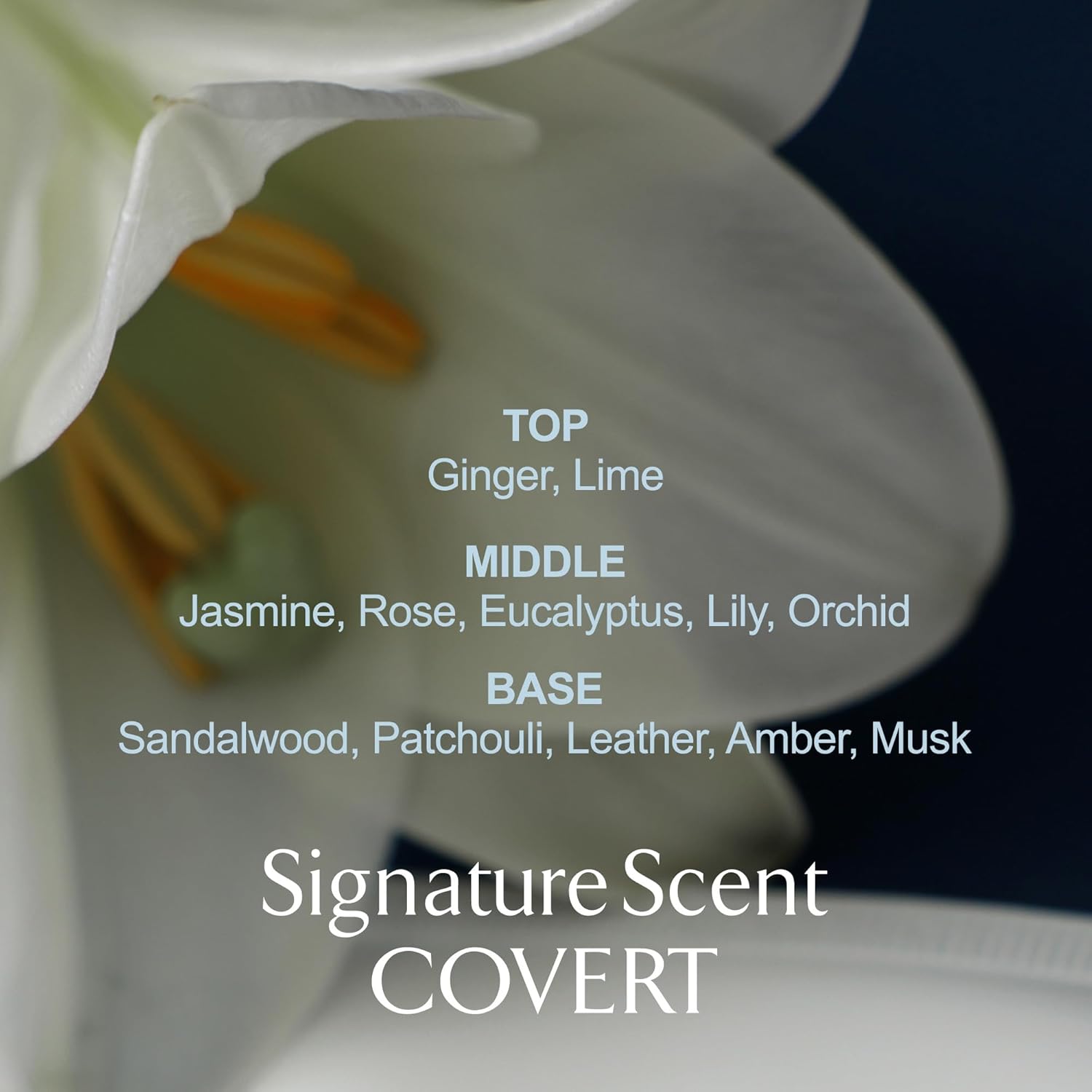 - 1.π³ COVERT SCENT_DEEP WOODY AMBER: A deep floral musk with intense woody amber notes. The spicy vibrancy of ginger and lime adds a fresh edge, balanced by lush floral notes, musk, and amber for a sensual and longlasting impression.