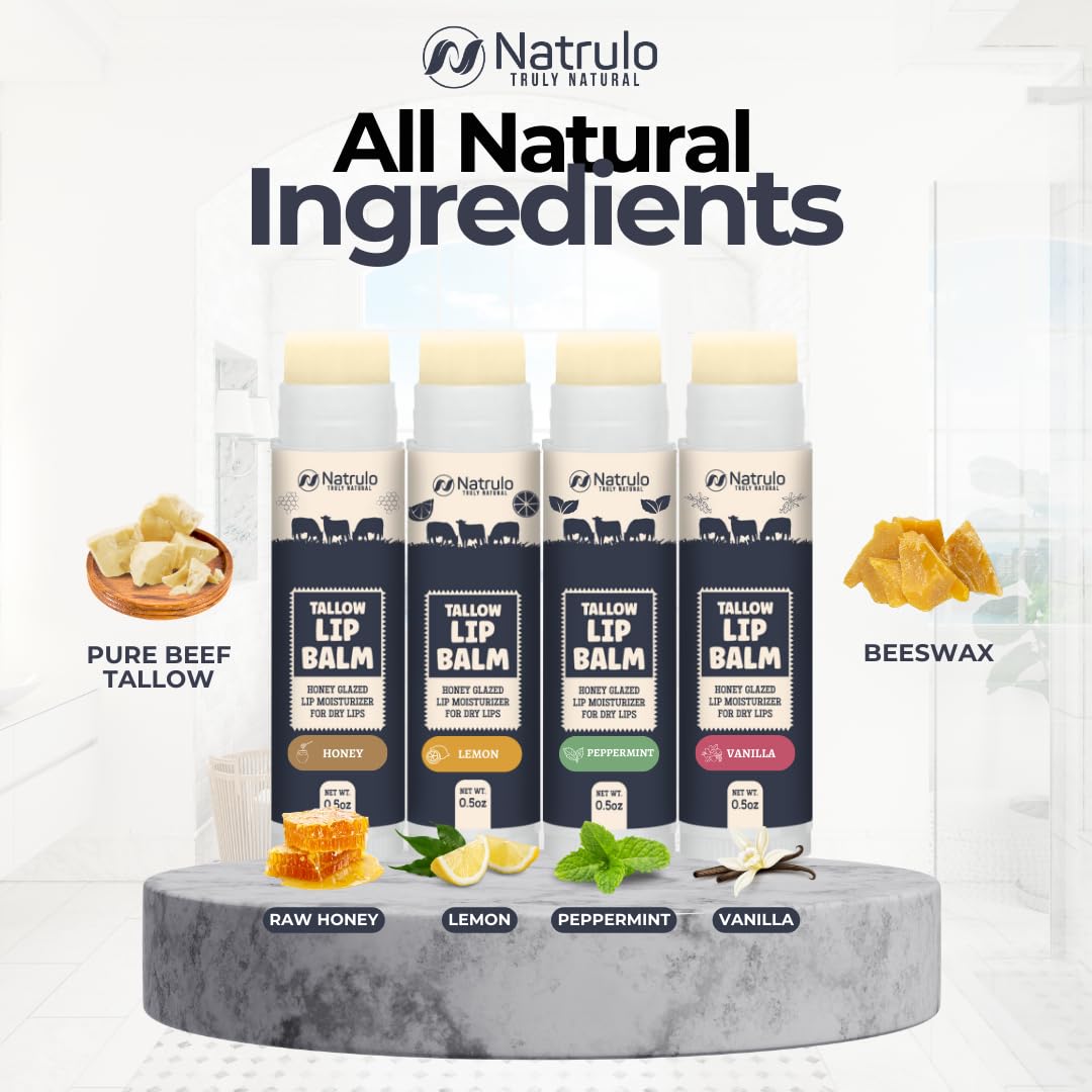 Beef Tallow Lip Balm – Natural Tallow Beeswax Chapstick – Hydrating Grass Fed Beef Tallow Honey Balm Lip Care – Soothes Chapped Dry Sensitive Lips – Long Lasting Vitamin Rich USA-Made Variety Pack