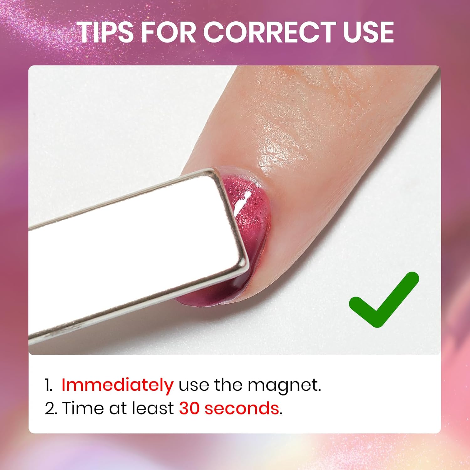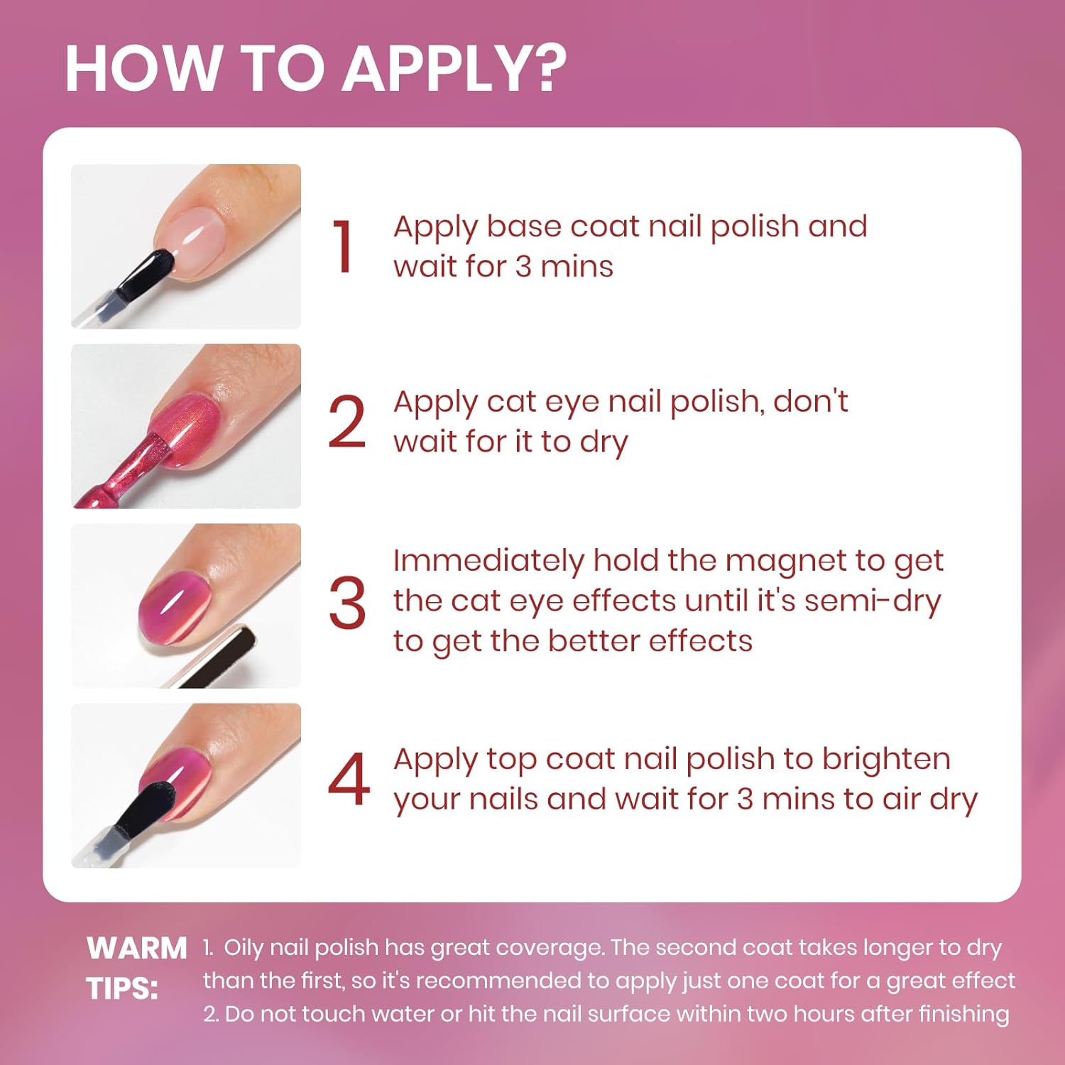 - Important Tips: 1. When the nail polish is not dry yet, it will be fluid. Use magnets to hold it in place until it's semi-dry, then take them off for a sharp cat-eye look 2. Do not touch water or hit the nail surface within two hours after finishing to avoid peeling; 3. Base and top coat nail polish art necessary