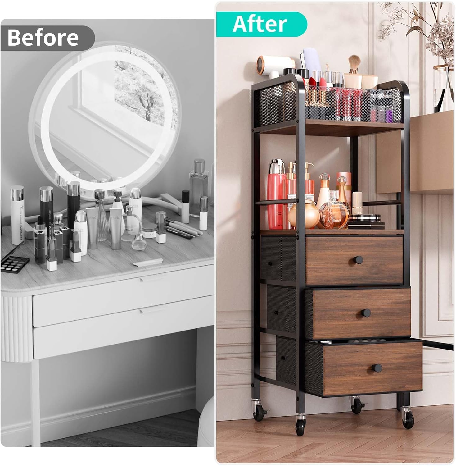 HapiRm Rolling Makeup Cart Organizer - Floor Skincare Make Up Storage with 3 Drawers, Vanity Organizer Cosmetic Display Cases Holder for Skin Care Perfume Nail Polish Brush Hair Tool