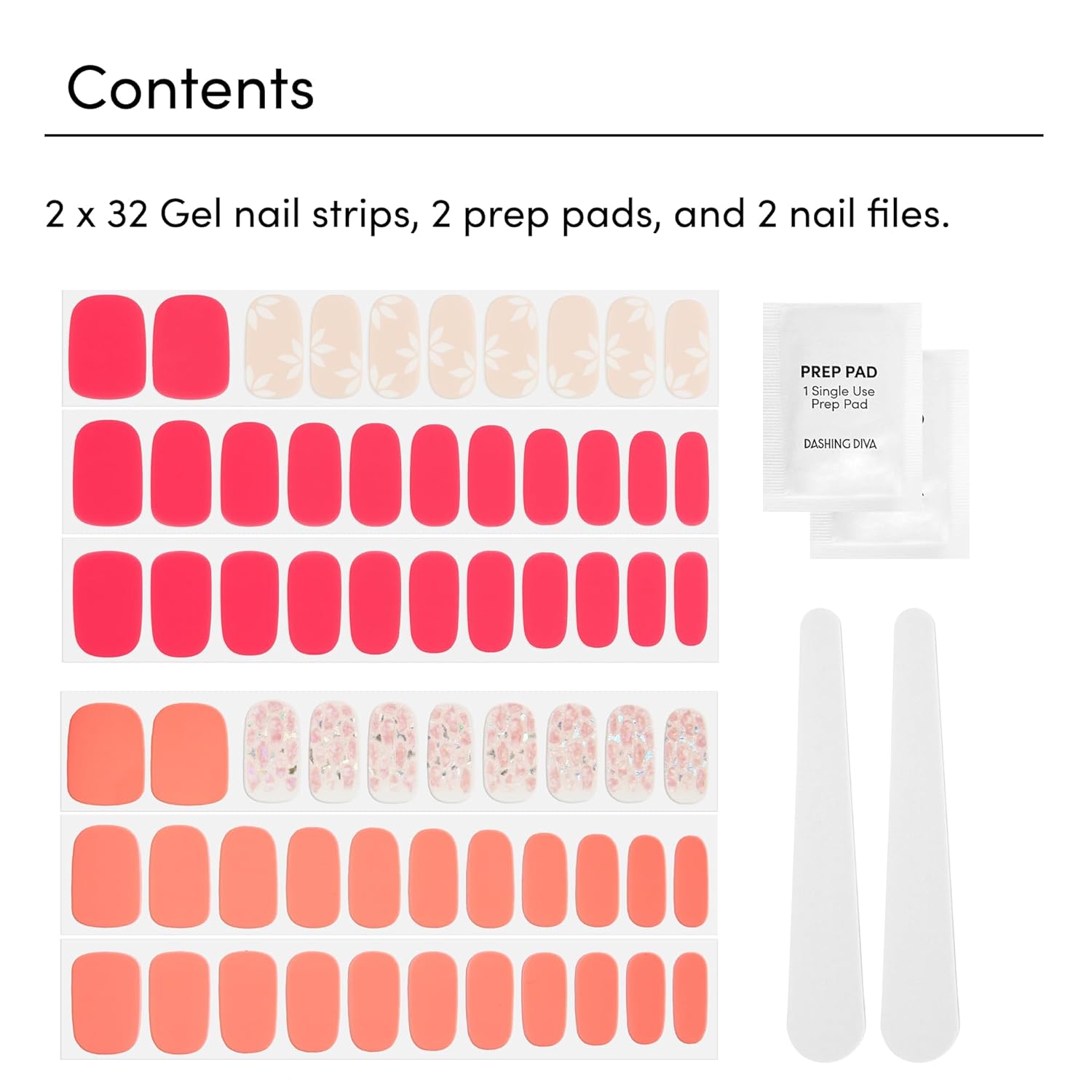 - Includes: 2 x Gel Strip Sets. Each set includes 32 gel manicure strips (20 base color, 12 accent), 1 prep pad, 1 nail file. Easily remove nail strips with nail oil or acetone