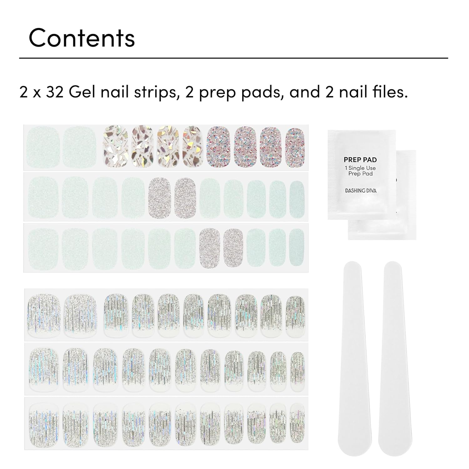 - Includes: 2 x Gel Strip Sets. Each set includes 32 gel manicure strips (20 base color, 12 accent), 1 prep pad, 1 nail file. Easily remove nail strips with nail oil or acetone