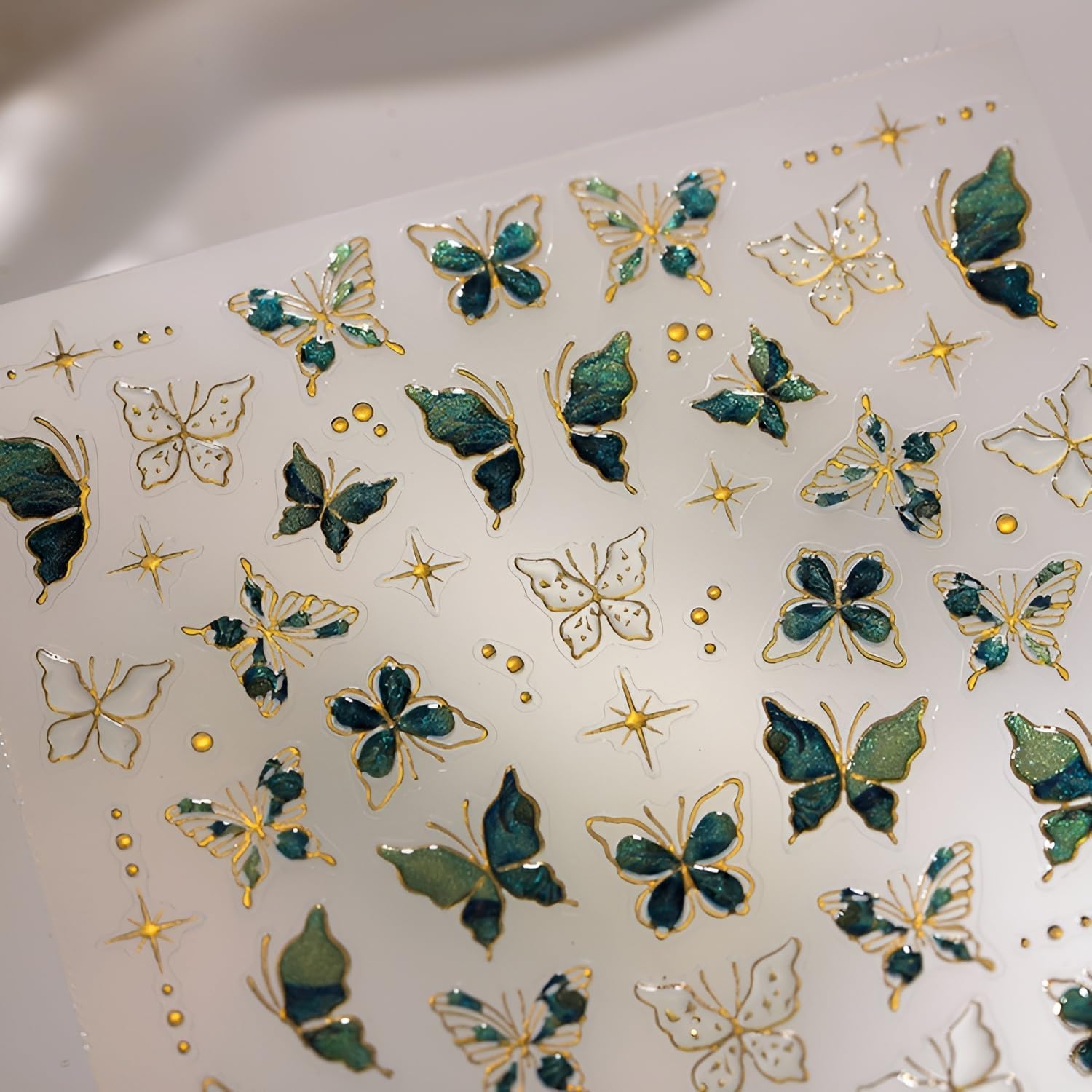 Green Butterfly Nail Stickers for Nail Art 5D Embossed Nail Decals Gold Butterfly Nail Art Stickers Cute Nail Supplies for DIY Manicure Self Adhesive Nails Design for Women