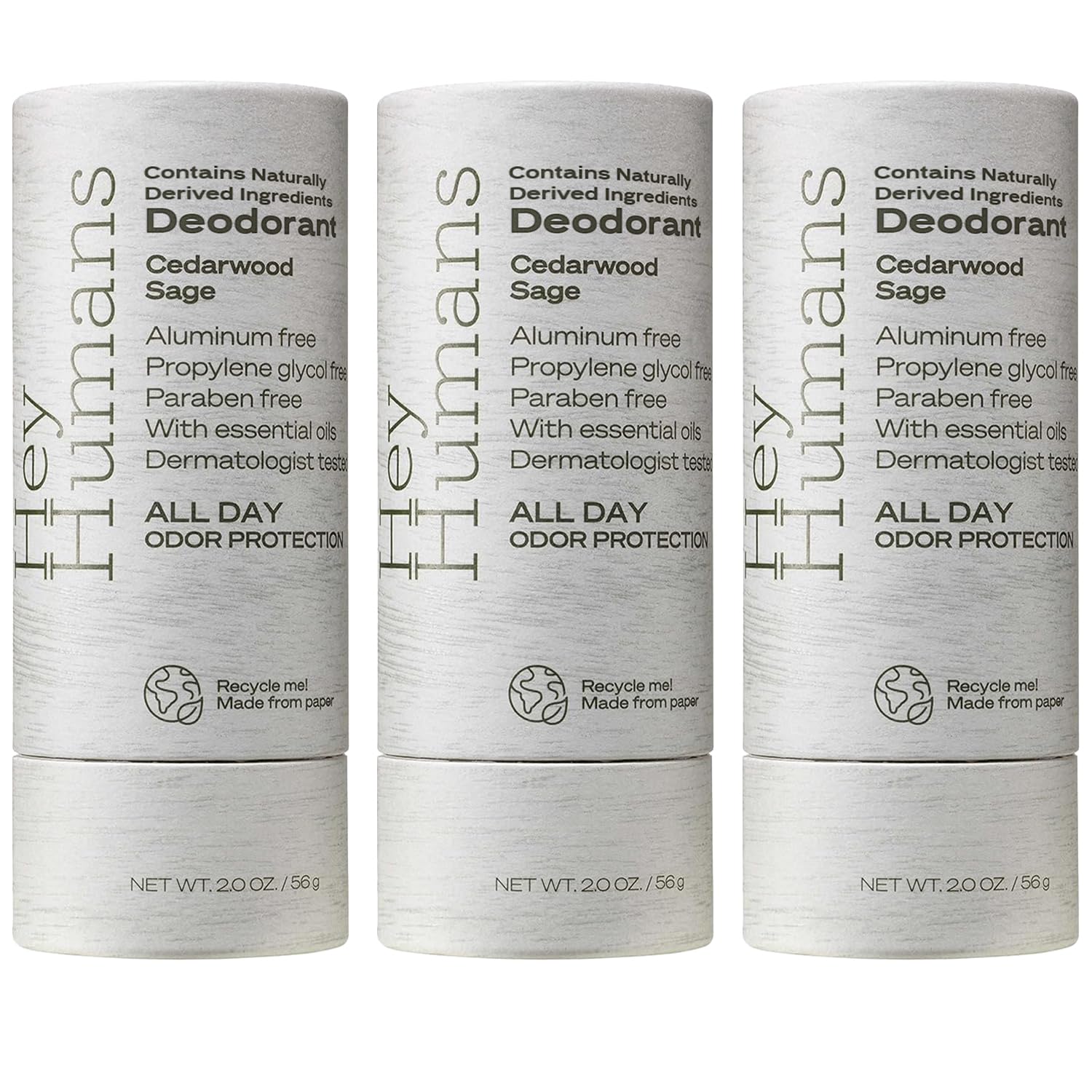 - Hey Humans deodorants for men and women are aluminum-free, paraben-free, phthalate-free, propylene glycol-free & silicone-free. They're also packaged in easily recyclabe paper for sustainability.