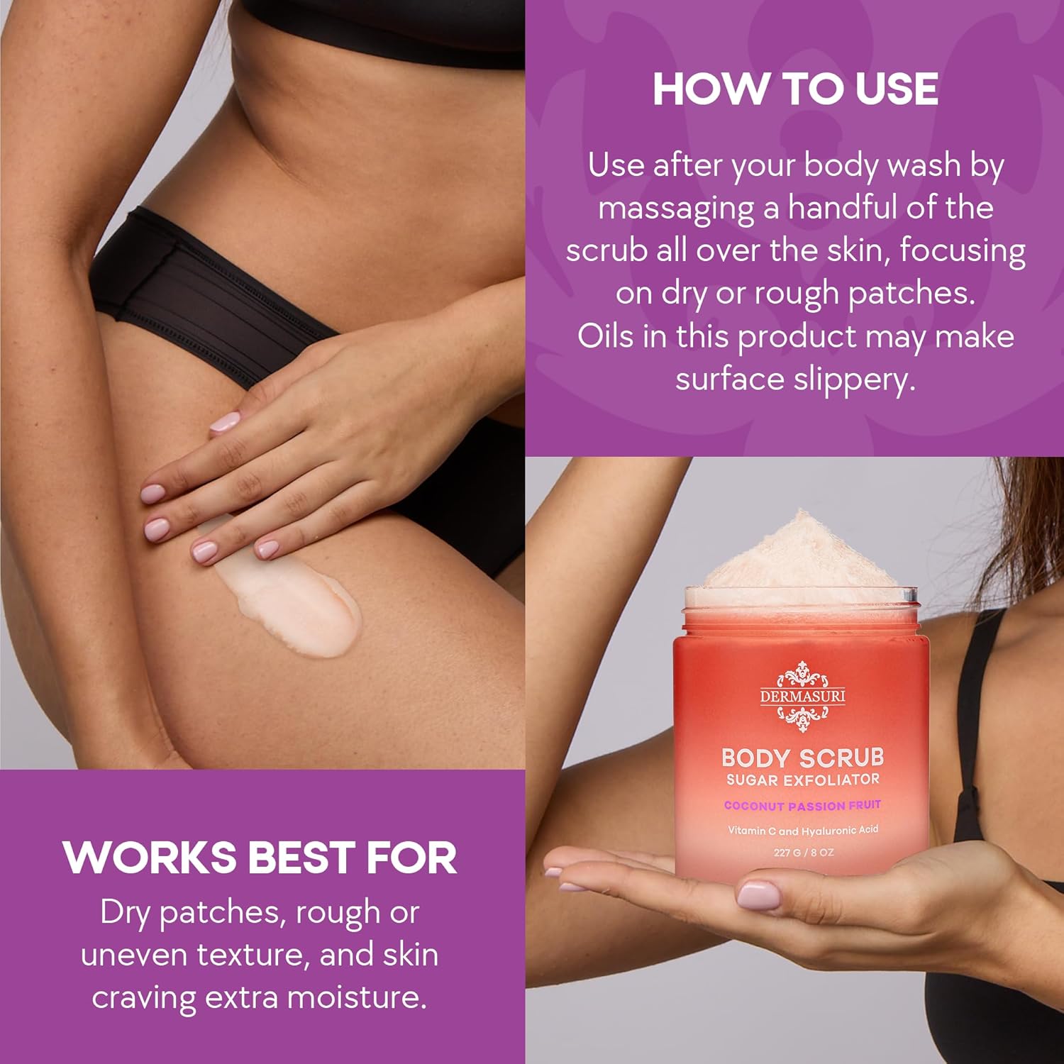 Dermasuri Exfoliating Sugar Scrub - Body Scrubber for Men & Women - Exfoliates & Removes Dead & Dry Skin for a Soft & Radiant Glow - Deep Hydration & Moisture - Coconut Passion Fruit