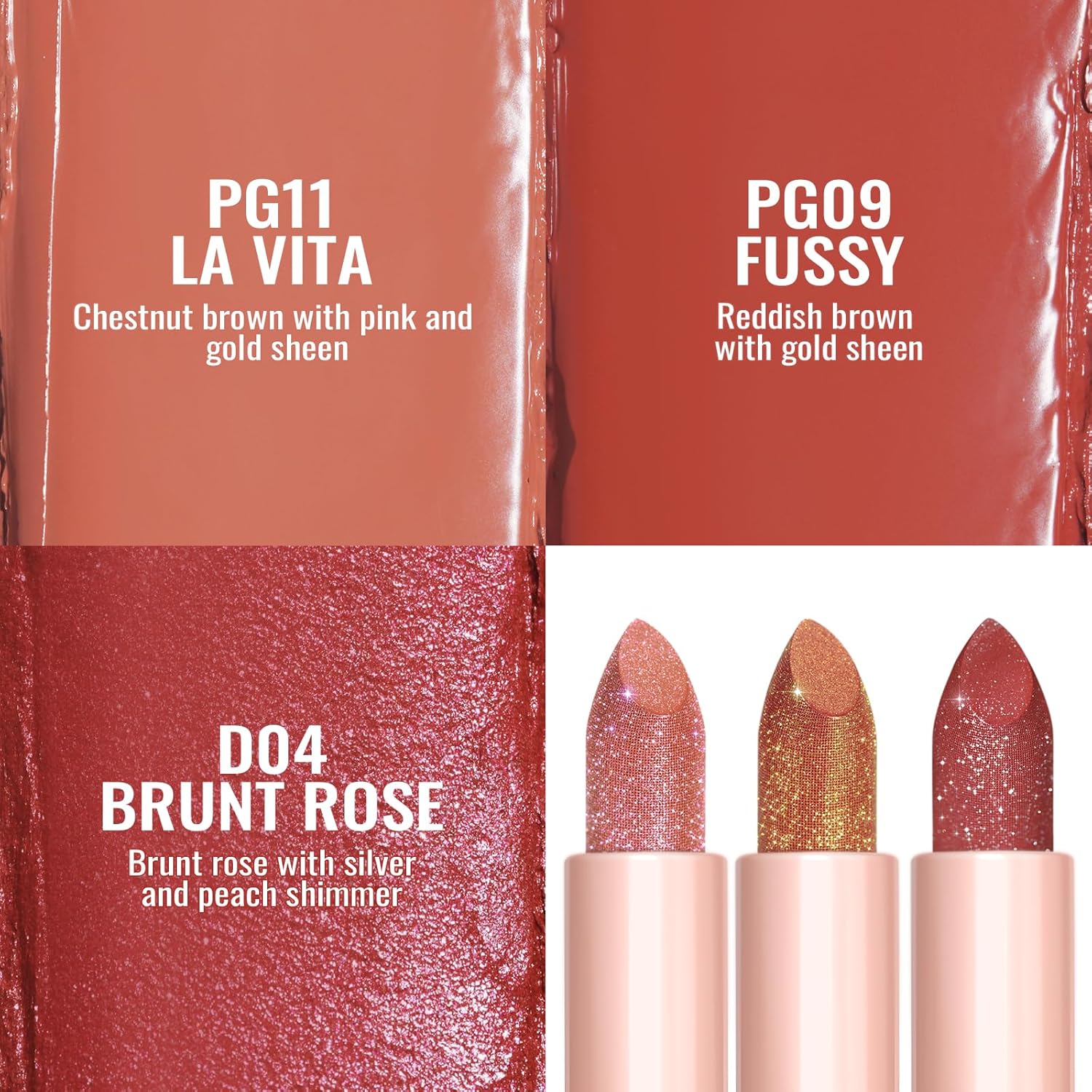 Oulac Moisture Shine Lipstick Set 3PCS - Infinity High Shine Finish, Hydrating Vegan Lipstick Infused with Damask Rose Oil for All-Day Comfort, Gluten-Free, PG11+PG09+D04
