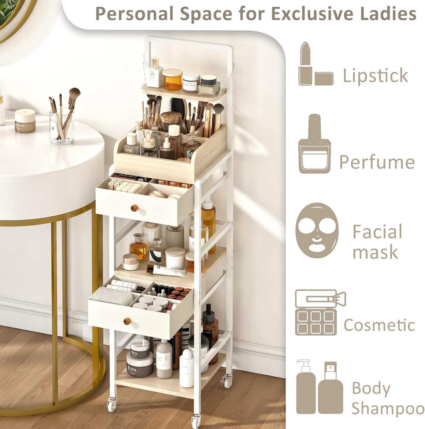 - Multi-Functional Makeup Organizer on Wheels – Rolling Makeup Storage Cart for Modern Women - This large-capacity makeup organizer doubles as a mobile vanity. The top section keeps daily essentials within easy reach, while spacious tiers below store all your beauty tools and skincare products.