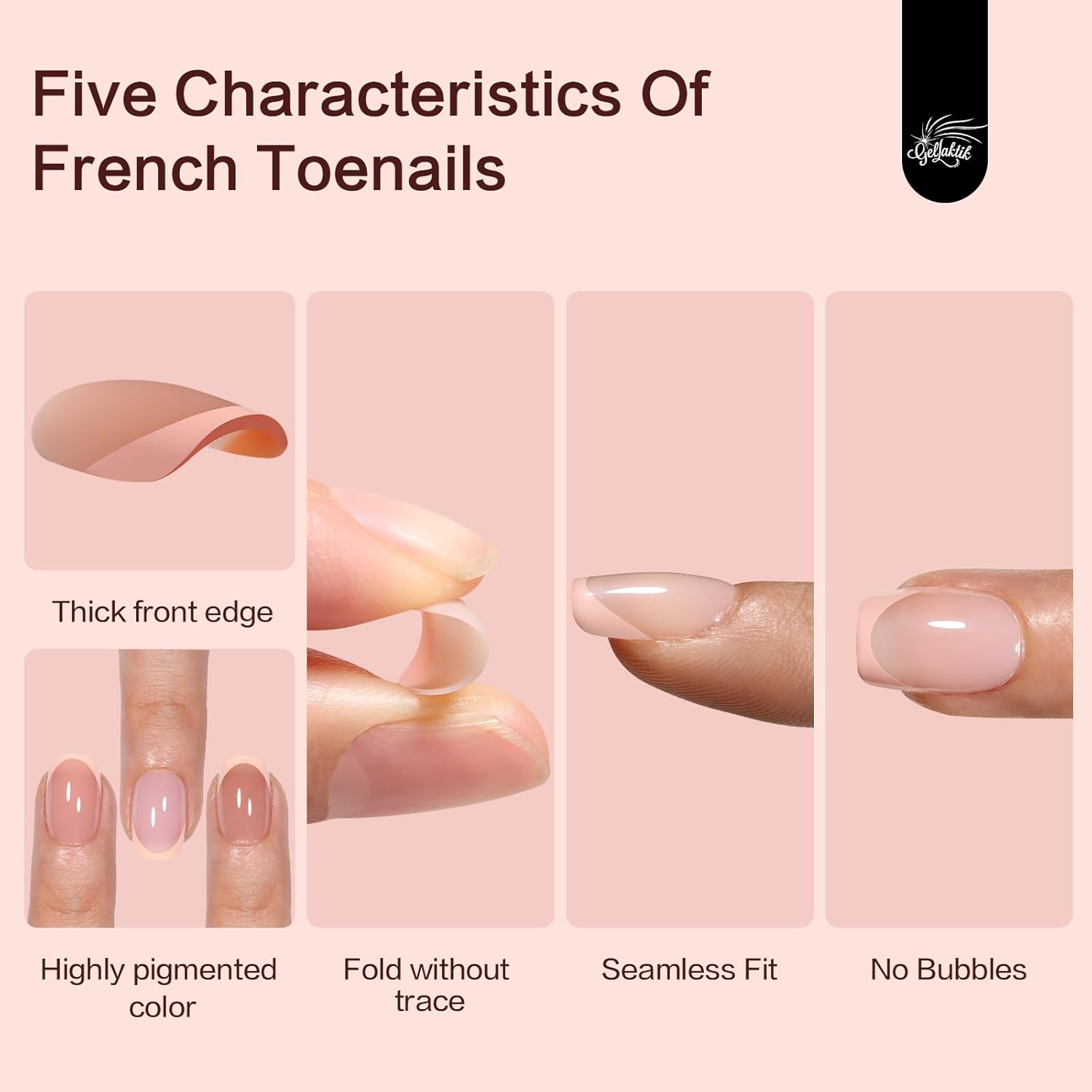 - 【Pre-Colored & Easy to Use】GELLAKTIK offers pre-colored Fake Nails in five popular shades, including pink, nude, and brown. Featuring a natural base and a classic short French Tip design, these Press on Nails are suitable for everything from work to special events. Simply apply a Gel Top Coat, and even beginners can achieve professional-looking results.