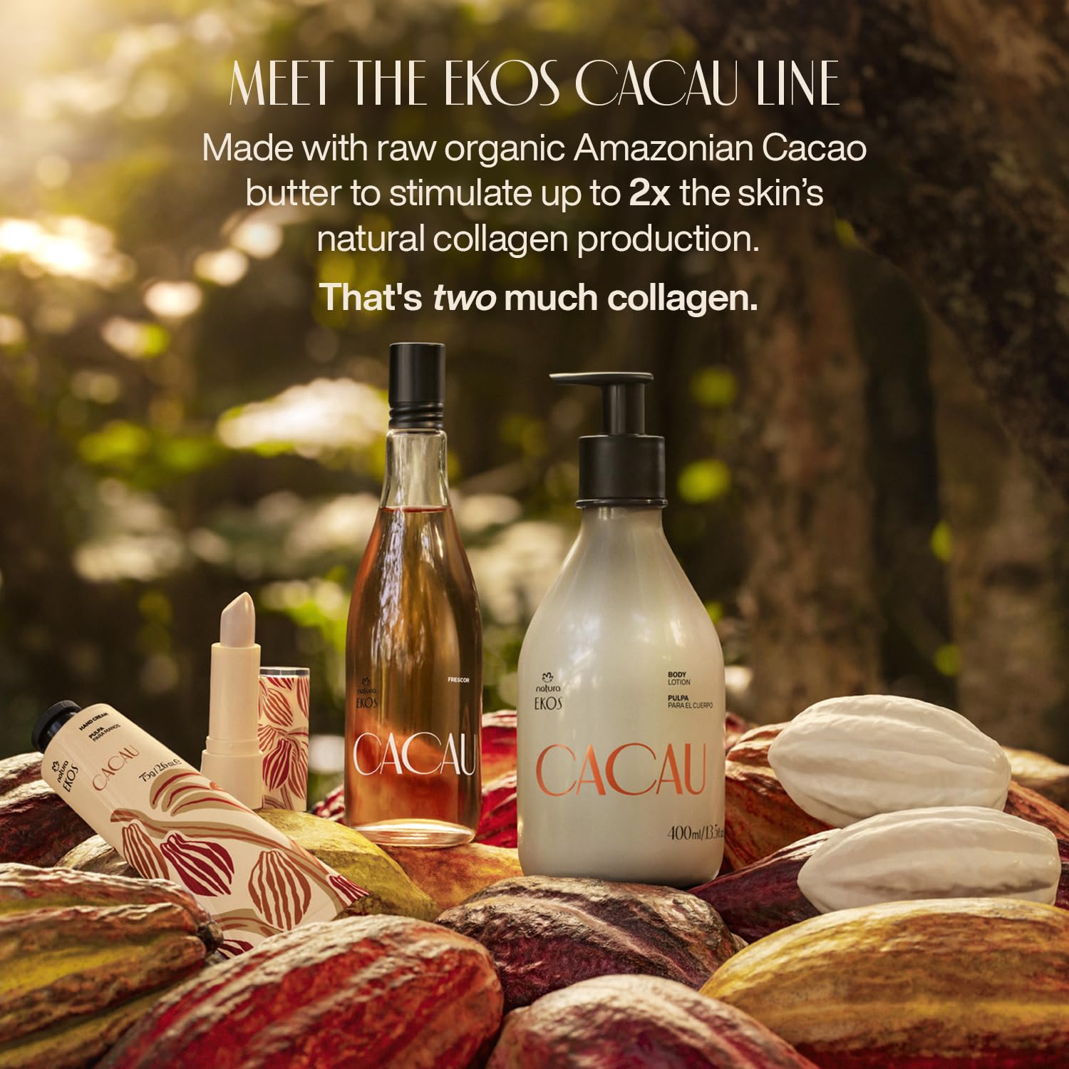 - Deeply Hydrated, Healthier Lips β Powered by Amazonian Cacau Experience long-lasting hydration and restored softness with Natura Ekos Cacau Lip Balm. Infused with raw, organic Amazonian Cacau butter, this balm stimulates up to twice the collagen production, helping to replenish dry, damaged lips while reinforcing your natural lip barrier.