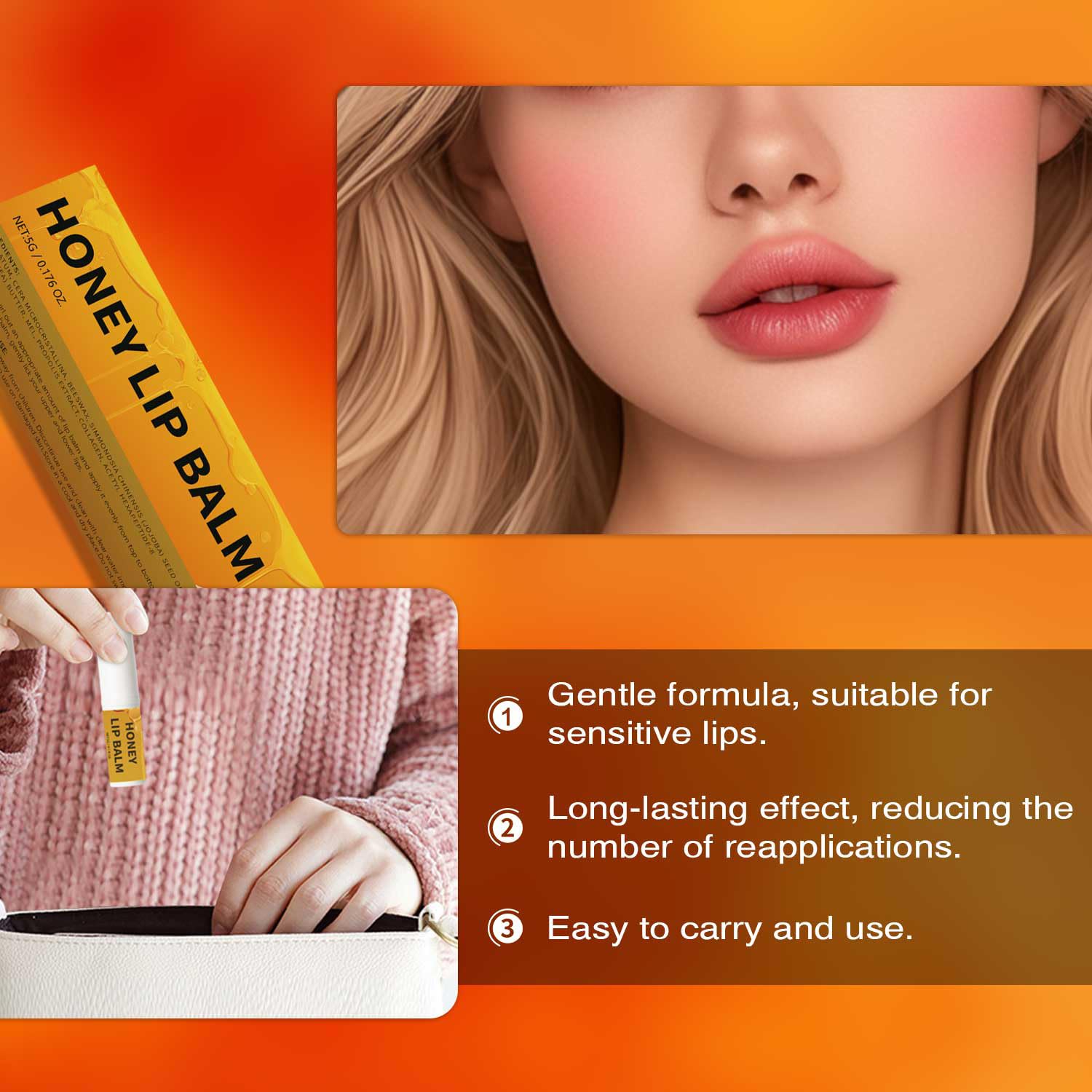 - Deeply Moisturizes Lips:The honey lip balm is a true savior for dry and chapped lips. Formulated with a unique blend of ingredients, it provides intense hydration that lasts throughout the day. The rich emollients in the balm penetrate deep into the skin, locking in moisture and preventing it from evaporating