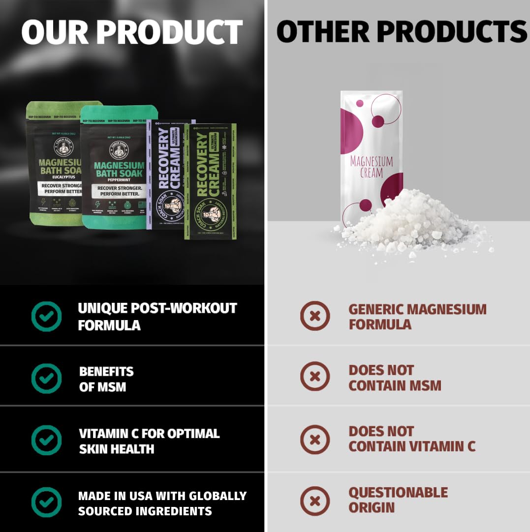 - Rejuvenating Coach Soak: Experience the invigorating benefits of Coach Soak's Magnesium Bath Flakes & Lotion Trial Pack, designed to support athletic recovery. Infused with magnesium flakes and menthol, it revitalizes and refreshes after intense workouts