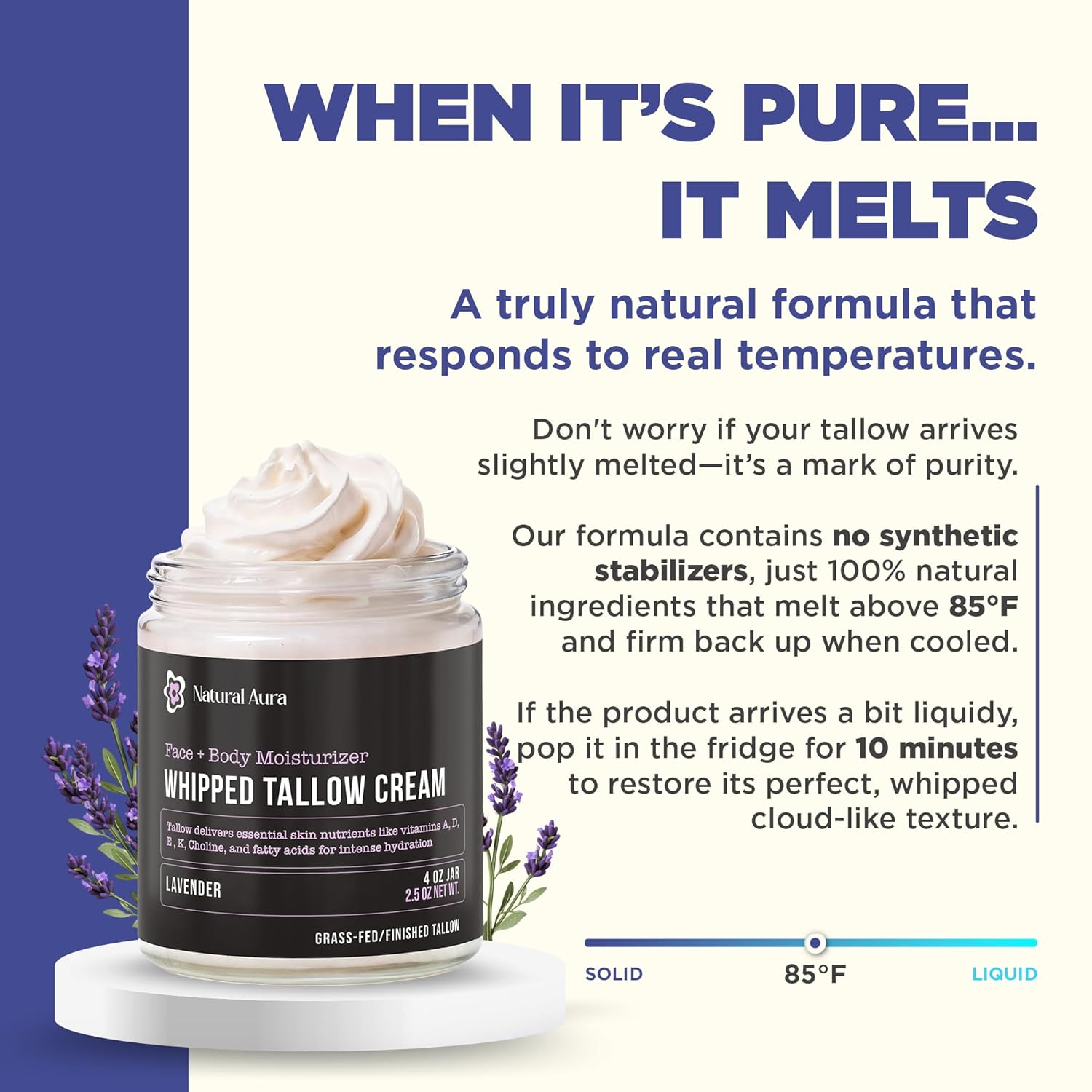 Whipped Beef Tallow for Skin - Face + Body Moisturizer, 100% Grass Fed Grass Finished Tallow and Honey Balm for Dry Skin - Natural Lotion - Free of Harsh Chemicals - 4oz, (Lavender)