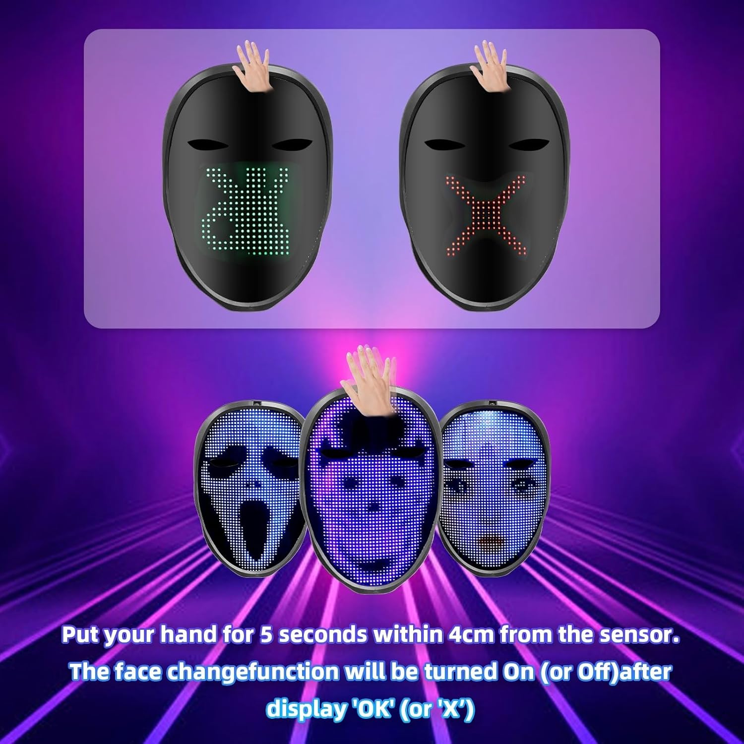 - Smart App & Gesture Control : Bluetooth Mask Connect via Bluetooth to the SHINING MASK APP for DIY programming: upload photos, draw custom designs, edit text (fixed/jumping/moving), and display music rhythms via microphone. Includes intuitive gesture sensing—cover sensor for "OK" to switch patterns with a wave; disable with "X" for effortless operation.
