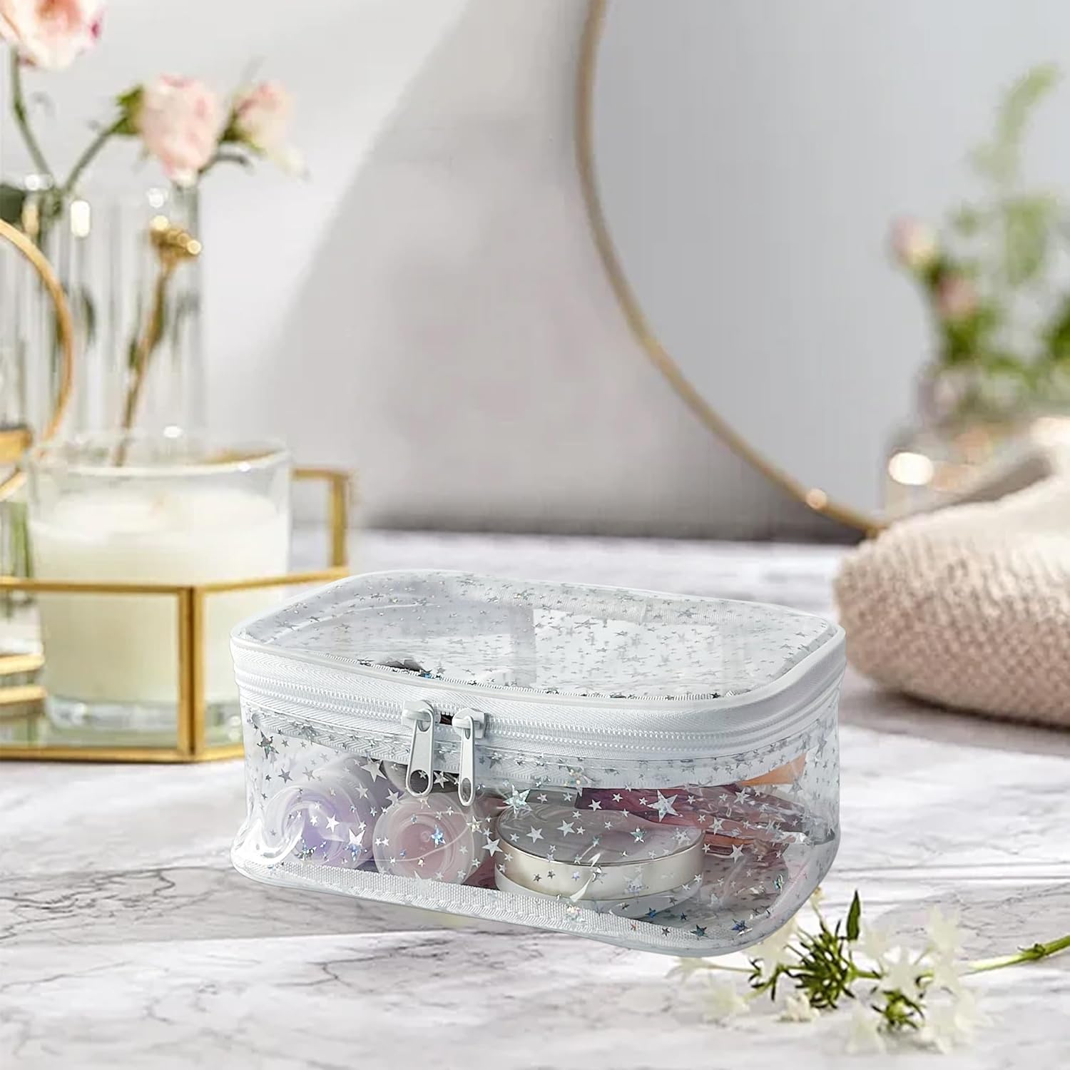 - ๐ทใWide Range of UsesใOur transparent holographic cosmetic bag can not only be used as a storage bag,waterproof bag,gift bag,frequently used item bag,but also can be used to store cash,glasses,keys,portable batteries,etc.This waterproof and dustproof tote makeup bag keeps everything safe and prevents liquid leaks