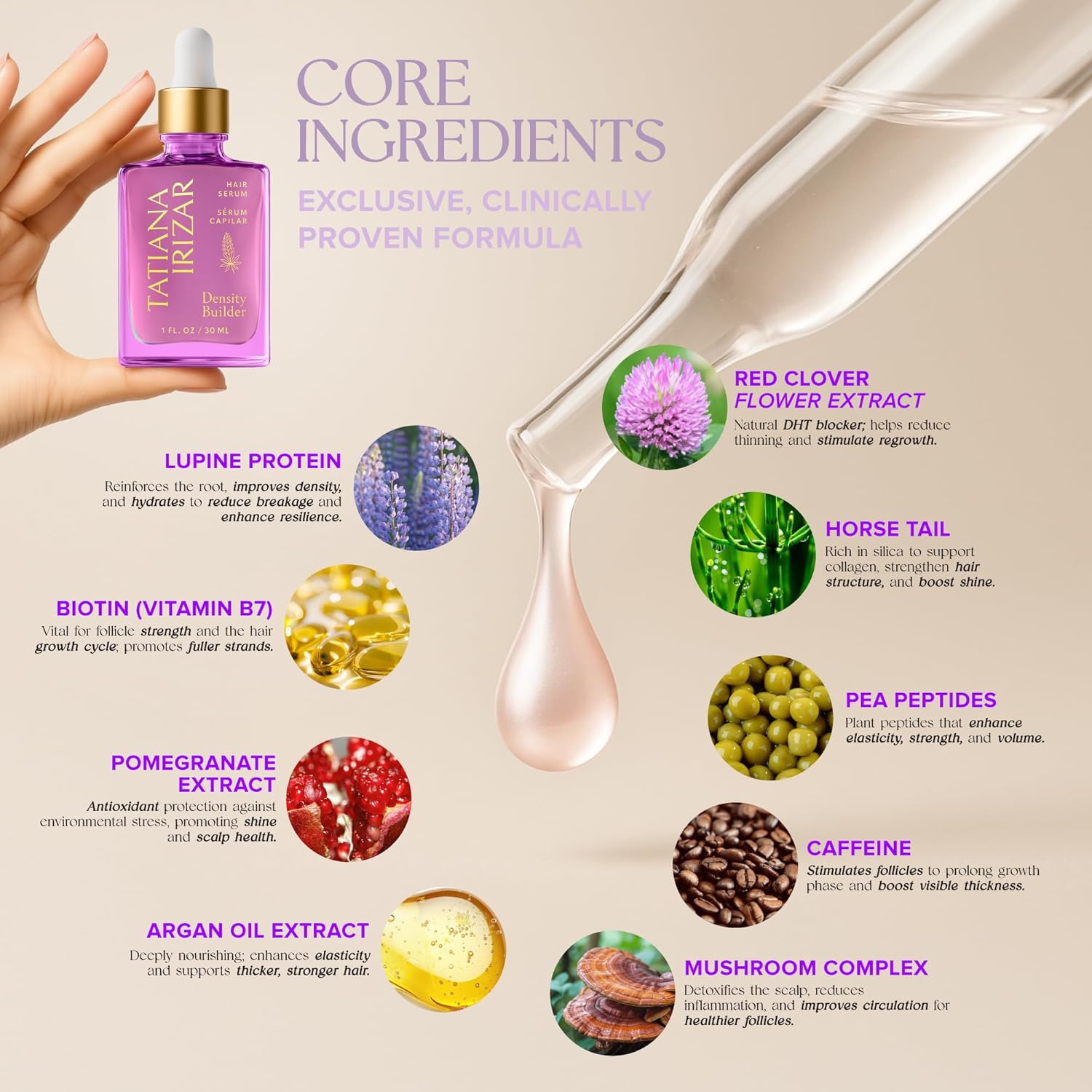 - POWERFUL HAIR THICKENING FORMULA β CLINICALLY TESTED INGREDIENTS:β¨ Tackle thinning hair head-on with our advanced thicker fuller hair growth serum. Formulated in the USA with Lupine Protein, Pea Peptides, Argan Extract, and Biotin, this potent blend strengthens hair, boosts density, and promotes visibly fuller, healthier-looking hair. Includes Red Clover, Horsetail, Mushroom Complex, Pomegranate, and Caffeine for a 360Β° scalp treatment.