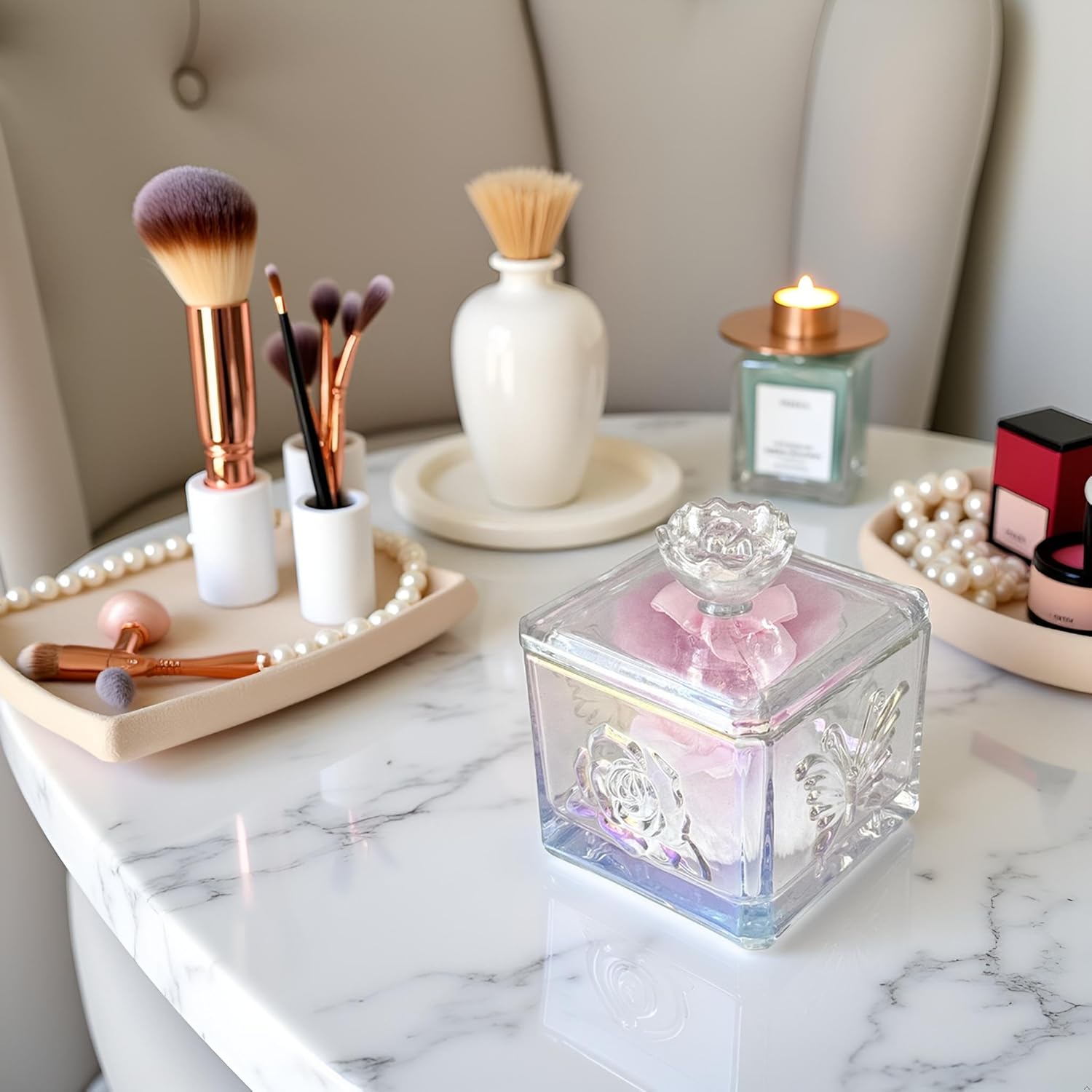 - 【Multi-Purpose Glass Box】This glass powder puff case can not only be used to store powder puffs, but also can be used to store earrings, rings, bracelets, hair accessories, knick-knacks, as well as other items in the dresser, bathroom and bedroom. It keeps your items away from dust and water, protects and decorates, and meets the needs of female users for cosmetic organization