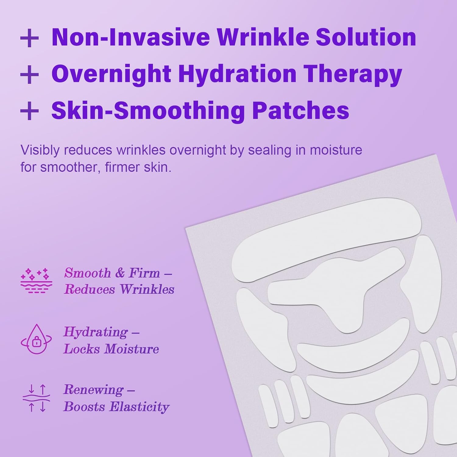 - OVERNIGHT ANTI-AGING CARE: Apply the anti wrinkle face patches before sleep to reduce fine lines caused by facial movement and dry skin; wake up to a smoother, refreshed look without needles or invasive treatments.