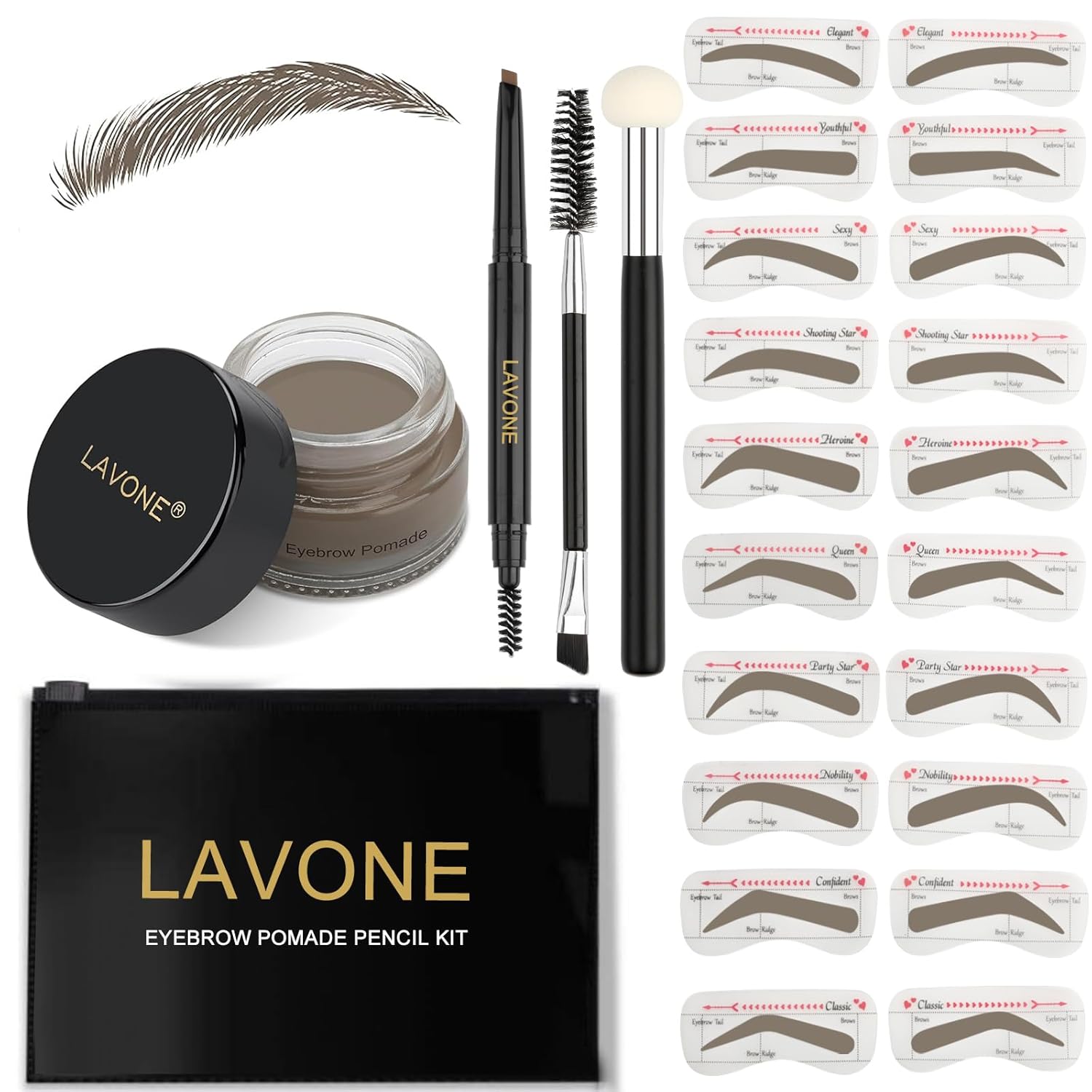 - [Whatβs in the eyebrow kit]: LAVONE makeup eyebrow kit includes eyebrow powder(dark grey), brow pencil (dark brown), 20 eyebrow stencils (10 different shapes), a sponge applicator, a dual precision brush and a zipper pouch for on the go.