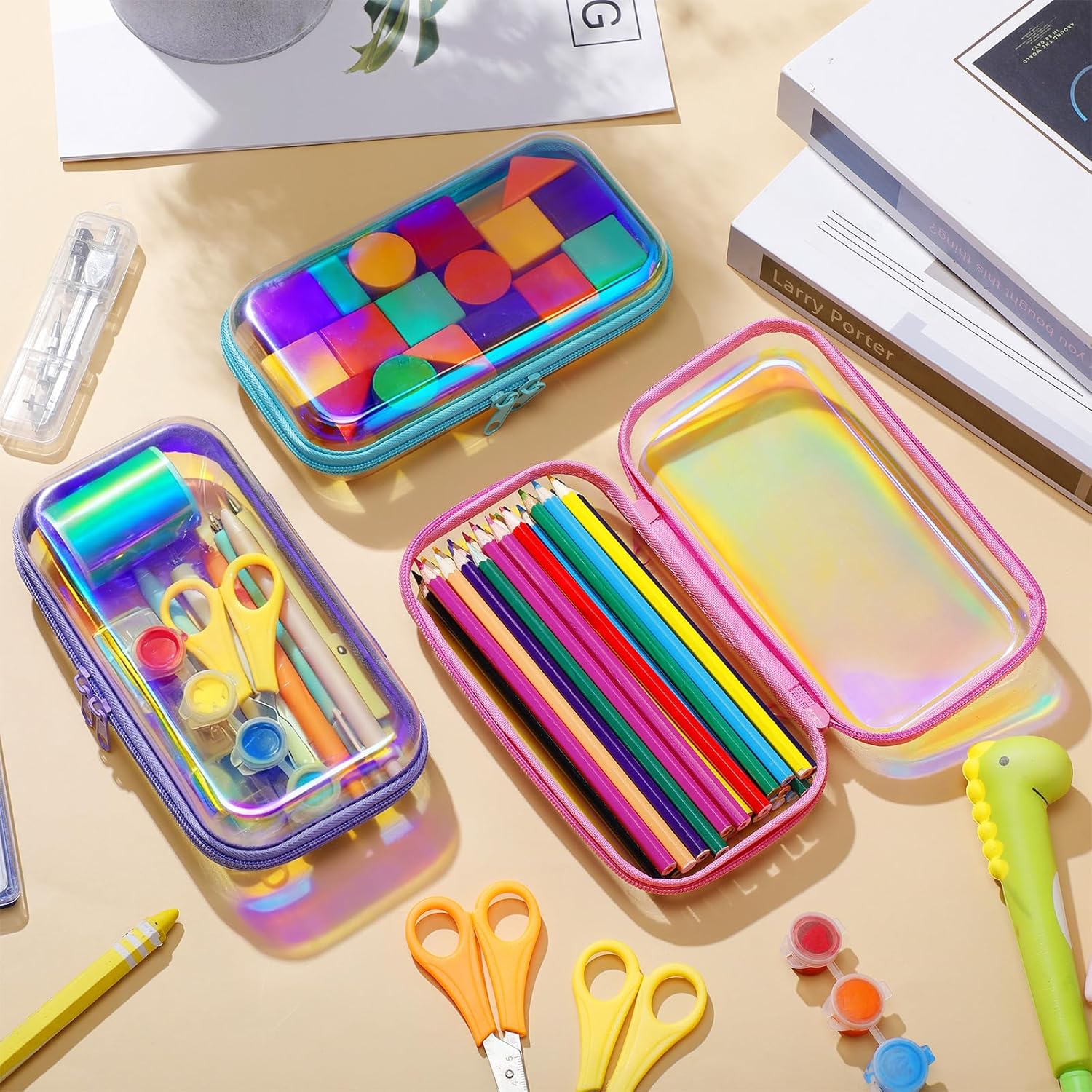 Hoolerry 3 Pcs Clear Hard Zipper Case Plastic Pouch Transparent Hard Case Clear Makeup Bag Portable Travel Organizer Bin for Cosmetics, Building Blocks, Puzzles(Laser,S)